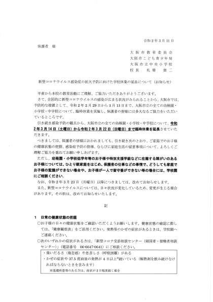 新型コロナウイルス感染症の拡大予防に向けた学校休業の延長について(お知らせ)