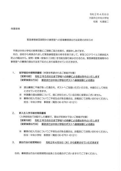 緊急事態宣言期間中の事務室への各種書類提出方法変更のお知らせ