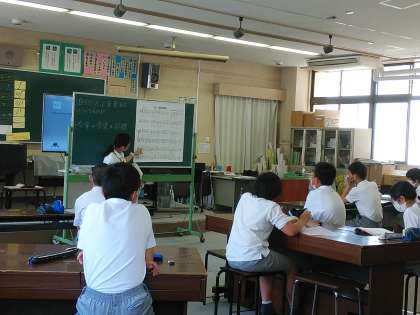 そして、本日の学習「おぼろ月夜」。手拍子で示されたリズムは、楽譜の何段目かを考えます。楽譜をじっくり見る子どもたち。ほぼ同じリズムだけど、三段目だけ少し違うことに気づきました。サイレントシンギングで、耳から聴く音と楽譜をゆききするなか、クレッシェンドなどの記号や、山なりになっている音の高低などにも気づきました。心ではきっといろんなことを感じていたのでしょう。いい表情でした。