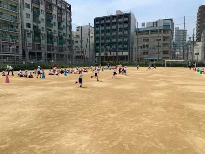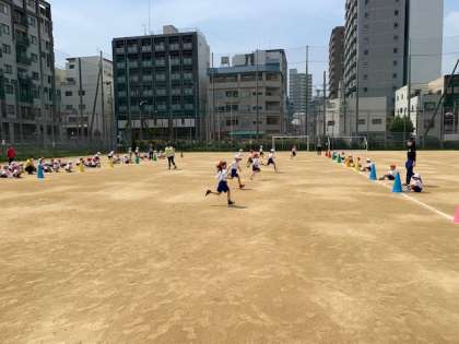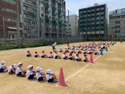きょうは 1ねんせいは ぐらうんどで かけっこを しました。