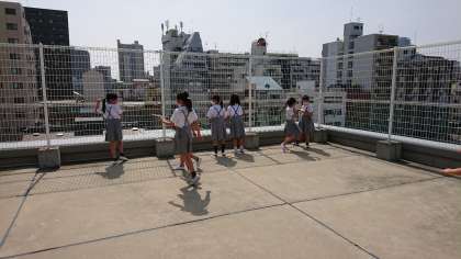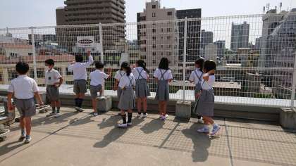 社会では、めったに入れない新校舎の屋上に行き、中央小の東西南北には何が見えるか、学習しました。「わたしたちのまちのようす」を学ぶ第1歩です。