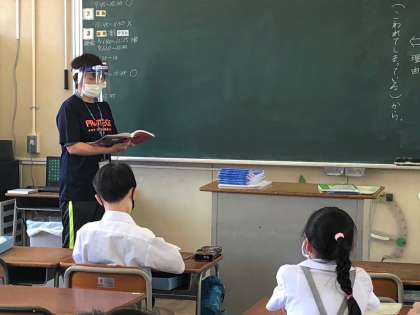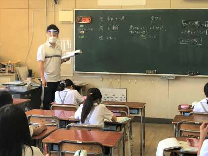 給食の配膳の時など、必要な時に先生はフェイスシールドを着用することもあります。