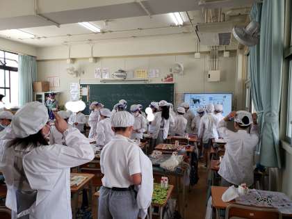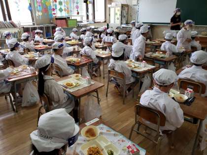 そして1年生から6年生まで給食準備はフェイスシールド着用です。