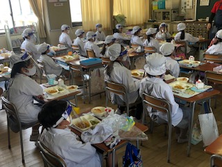 今年度、初めて学級の子どもたちが全員集まっての給食が始まりました。フェイスシールドを着用して配膳して、食べ物へ感謝の気持ちを示して「いただきます。」をしました。明日からの給食が楽しみです。