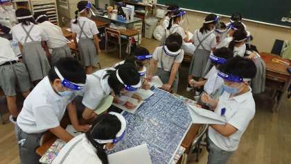 社会では、学校の屋上からさらに上空に飛んでみた大きな写真を見て、東西南北それぞれ何が見えるか、観察をしました。