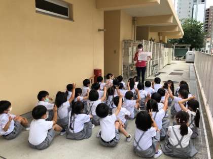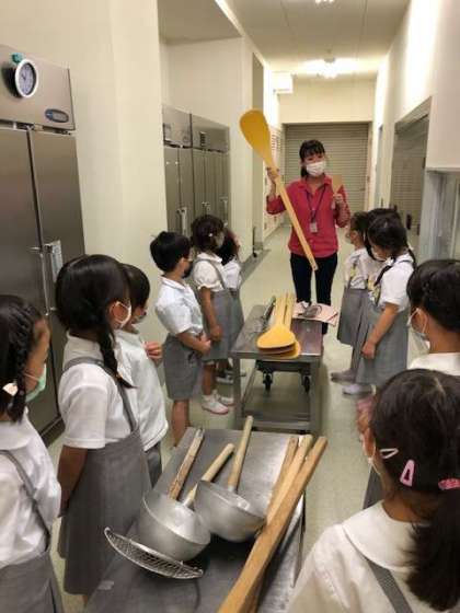 1ねんせいは、 いま きゅうしょくしつを たんけんする かつどうを しています。 きゅうしょくしつの なかに はいって、 きゅうしょくを つくっている ようすや きゅうしょくに つかっている どうぐを みせてもらいました。 「こんなどうぐを つかっているんだ。」「おいしそうな においがする。」など、 きゅうしょくが ますます たのしみになる 1ねんせいでした。