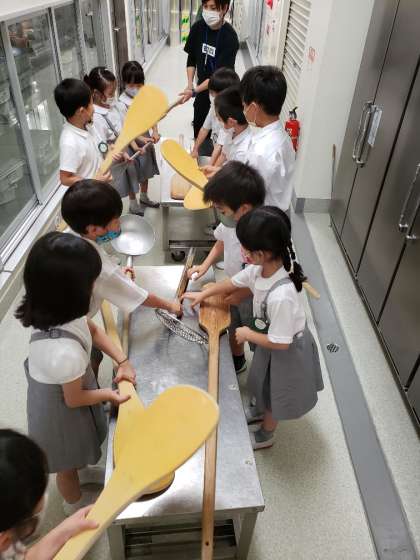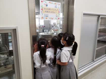6月末から7月にかけて1年生の学習の一環で給食室の探検をしました。