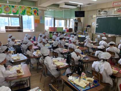 給食室にはクーラーが付いていないので、作業負担軽減で品数は1品少ないです。