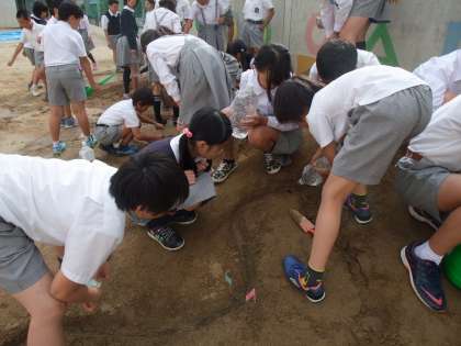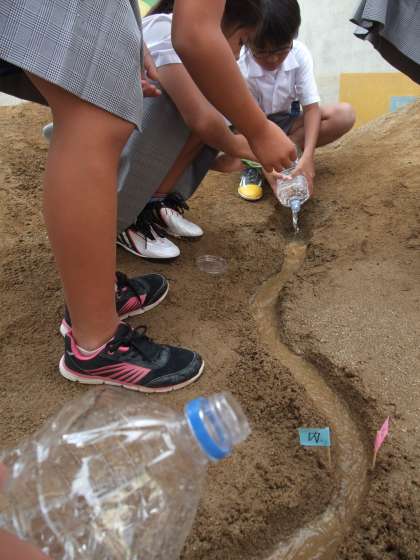 「流れる水のはたらき」を砂山に水を流して調べました。