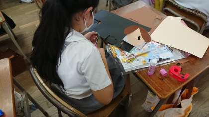 今、図工では「ゴムゴムパワー」という、ゴムの力で前や上に進む仕掛けの入った工作に取り組んでいます。