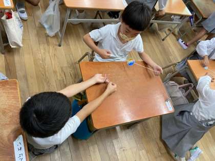 コロナウイルスで1年生といっしょにおもちゃランドを楽しむことができませんでしたが、1年生にぶんぶんごまをプレゼントしました。