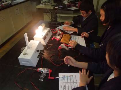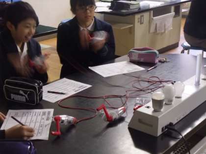 白熱灯、蛍光灯、LEDの三種類のランプを使って実験し、必要な電力量を調べました。