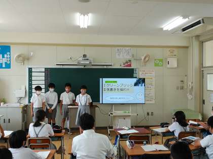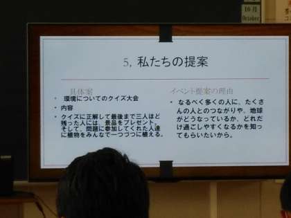 公園にポイすてされたごみを拾い実態調査し、ごみ拾いイベントで、ギネスに挑戦したり、商店街とコラボしクーポン券を配ったりすると町が活気づくと提案した班。