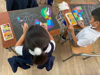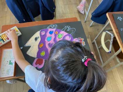 自ゆうに思いえがいた魚をボンドやパスをつかってえがきました。