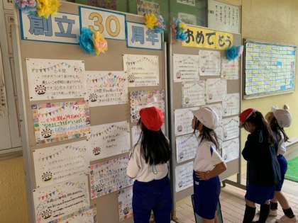 各クラスで考えたお祝いメッセージを、ピロティに掲示しています。