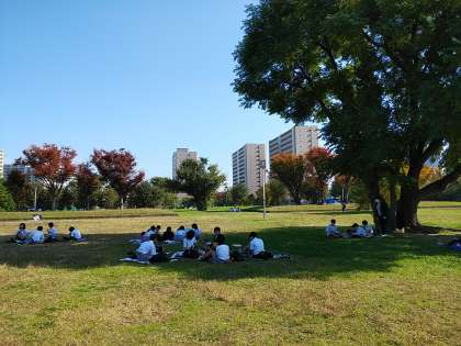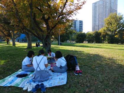 いい天気のため、めいめい木かげでお弁当を広げました。