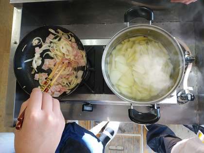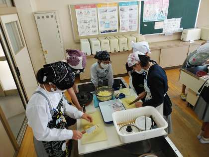 調理実習で、ジャーマンポテトを作りました。炭水化物、脂質、たんぱく質、ビタミンと、栄養バランスのよい副菜です。