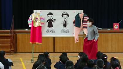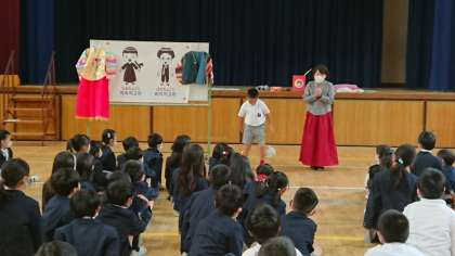 あいさつやチョゴリ(着るもの)のお話を聞き、最後は韓国・朝鮮の遊びを教えていただきました。