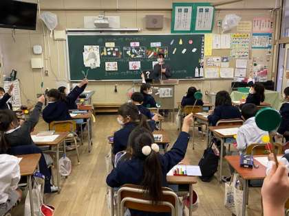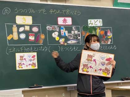 食べものには、黄・赤・緑で表す3つのグループがあり、それらを食べないと、私たちの身体にどのような影響を及ぼすのかを考えたり、いろんな食べもののカードを色分けしたりしました。子どもたちは、「緑の野菜が苦手だったけれど、体調を崩さないためにも頑張って食べたい。」や「給食には、3つの栄養が入っていることがわかった。」など、学習の振り返りをしっかり書いていました。この学習を通して、好き嫌いなく食べようとする気持ちをもってほしいと思います。