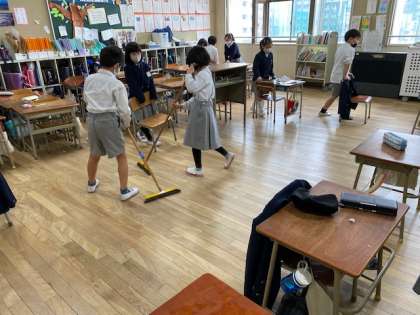 そうじの時間は、いつもより5分長く活動し、学校をピカピカにします。
