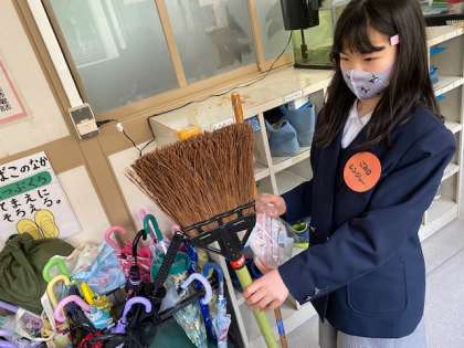 美化委員は、各清掃場所に行って、みんなのお手伝いや応援をします。傷んだほうきがあれば、交換もしました。
