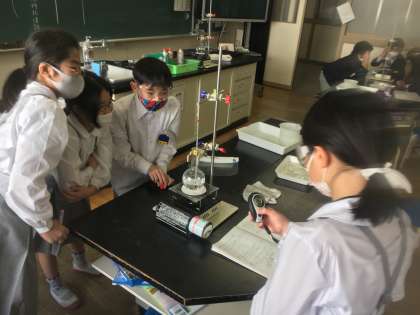 理科の実験で理科室へ行き、水を熱したときの変化を観察しました。新しく『ふっとう』という言葉を知ることができました。ストップウォッチ係、記録係、温度を読み上げる係で役割分担をして学習をしました。