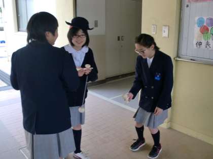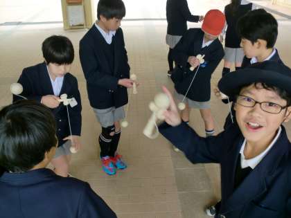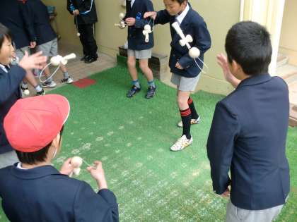 さっそく大人気で、みんな輪になり技に挑戦しています。
