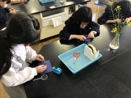 ピンセットを使って、花びらやがく、おしべ、めしべなど、ていねいに分解し、画用紙のうえに並べて、よく観察します。