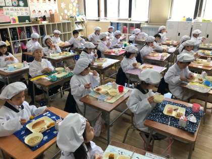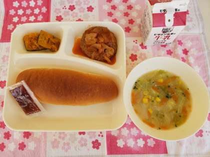 今日のこんだては、煮込みハンバーグ、コーンスープ、焼きかぼちゃです。