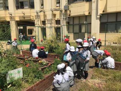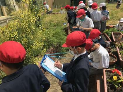 春の日差しが心地よく降りそそぐもと、校庭にいる生き物の観察に取り組みました。