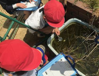 プランターにたまった水の中にとても小さな生き物を見つけ、虫めがねを使って熱心に観察する子もいました。