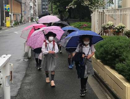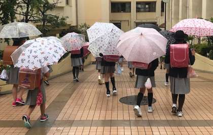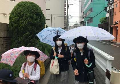 正門を入ったところのピロティに色とりどりの傘の花が咲きだしました。