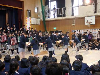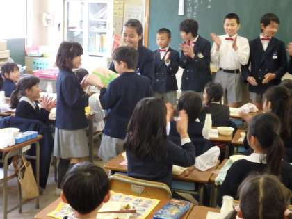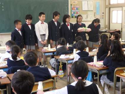 給食の時間に、わざわざ教室までプレゼントを届けてくれました。たてわり班でお世話になったお兄さん・お姉さんが教室に来てくれるだけで、とても嬉しい2年生は、もう大喜び!プレゼントでもらった雑巾で、お掃除を一生懸命がんばります!6年生のみなさん、ありがとうございました。