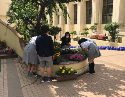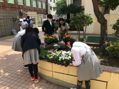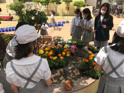 正門を入ったところの花壇では、飼育園芸委員会の子どもたちによって、色とりどりの新しい花々が植えられます。