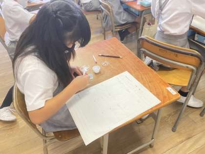 理科の学習で、ホウセンカ・マリーゴールド・ヒマワリの種を観察しました。虫めがねを使って、形や色を観察している様子です。この後、3つの種を比べてそれぞれの特徴について考えました。