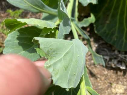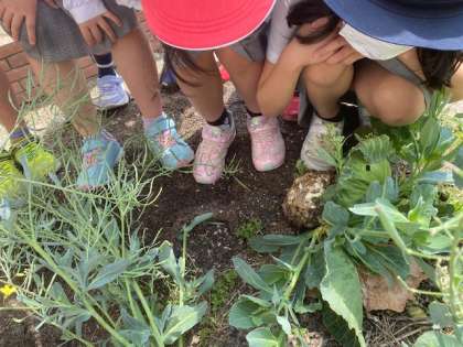また、学習園ではモンシロチョウのたまごも観察しました。子どもたちは実際のたまごの大きさにおどろいていました。