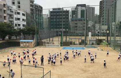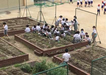運動場の真ん中では、体育でボール運動、そのとなりの学習園では、生活科で植物の観察。