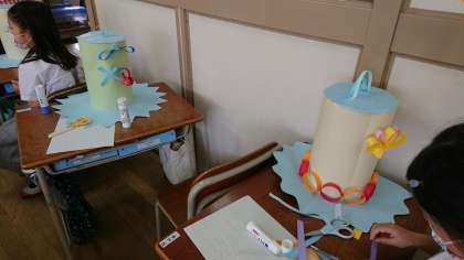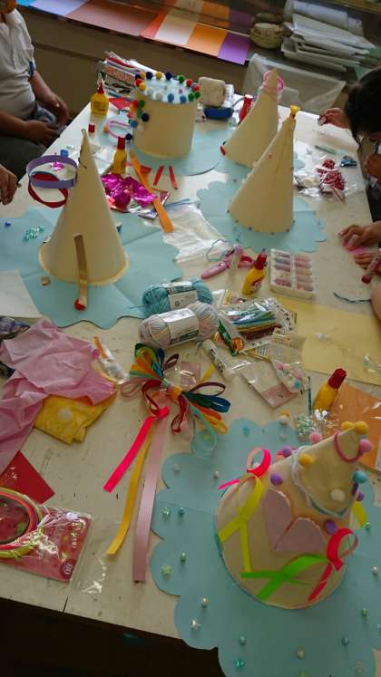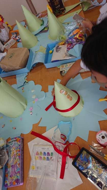紙テープやモールをつかって、どんなわっかを作れるか考えて、ぼうしをかざっています。