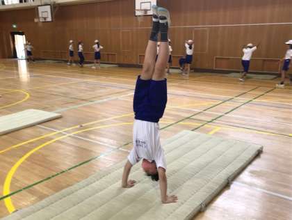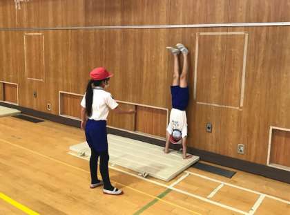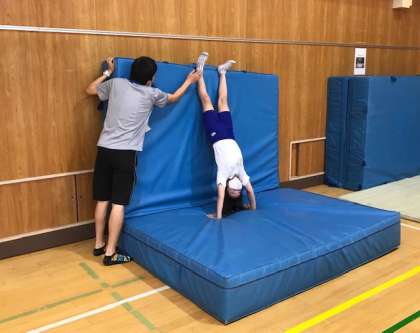 まずは、倒立がしっかりできるように、セーフティ・マットや壁を使って練習していきます。