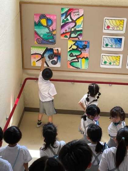 2年生からもらった校内の地図に、探検したところは丸をつけたり、見つけたよカードに印象に残った教室の絵を描いたりしました。