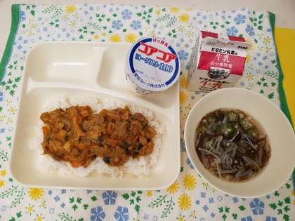今日の給食はカレー丼、オクラともずくのとろり汁、ヨーグルトでした。