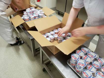 ヨーグルトの配缶の様子です。学校のコアコアヨーグルト、大人気です。