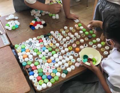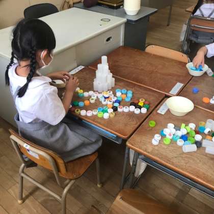 ならべていくうちにつくえいっぱいに広げた子や、たてにならべてつみあげていく子もいました。