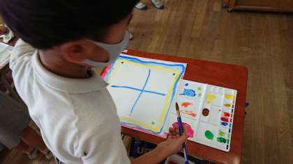 ま四角の紙にもようをかいていきますが、ここで一くふう。