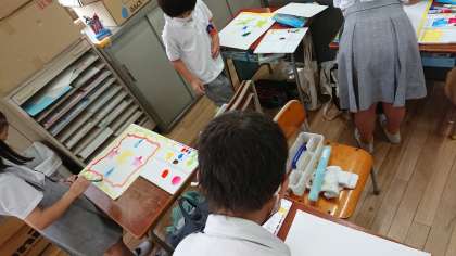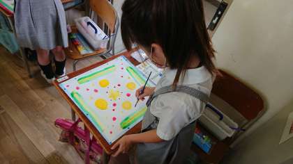「まずは赤と黄色の線を引いて…。ここはみどりの点にして…。」