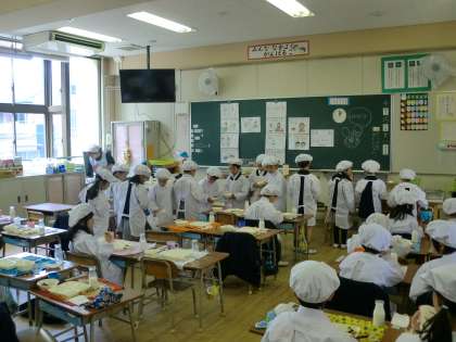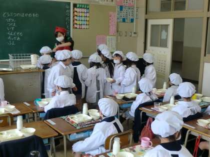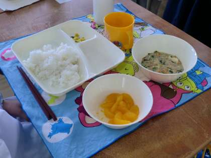 今日の給食には、みかんのかんづめが出ました。おかわりをしたい子が多く、長い列ができていました。