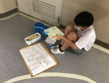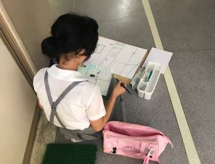 放送室の前を通ると、二人の児童が一生懸命に画用紙に向かっています。
