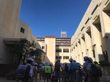 正門から子どもたちの頭上を見あげると、澄み渡った青空に白い月がぽっかりと浮かんでいました。