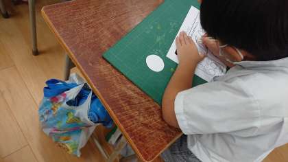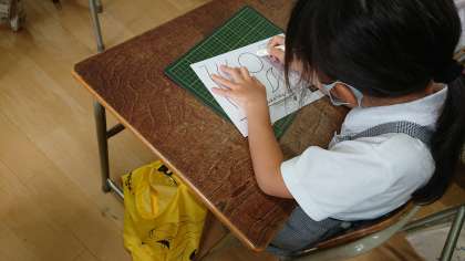 あんぜんだい一、もち方や力の入れ方に気をつけて、紙を切るれんしゅうからしています。