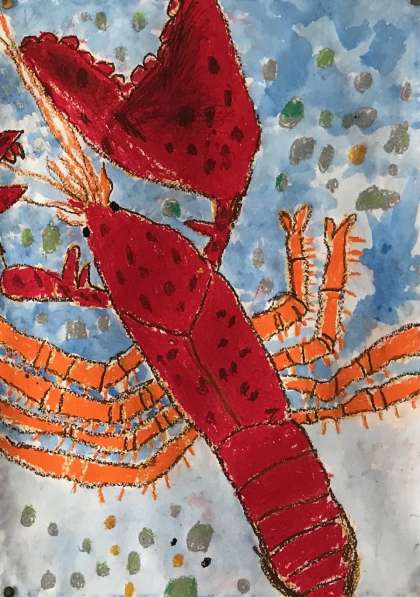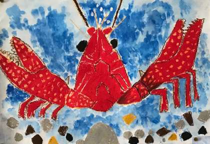 ザリガニだけではなく、背景の水や小石についても、ぼかしの技法を使って工夫して表現しています。